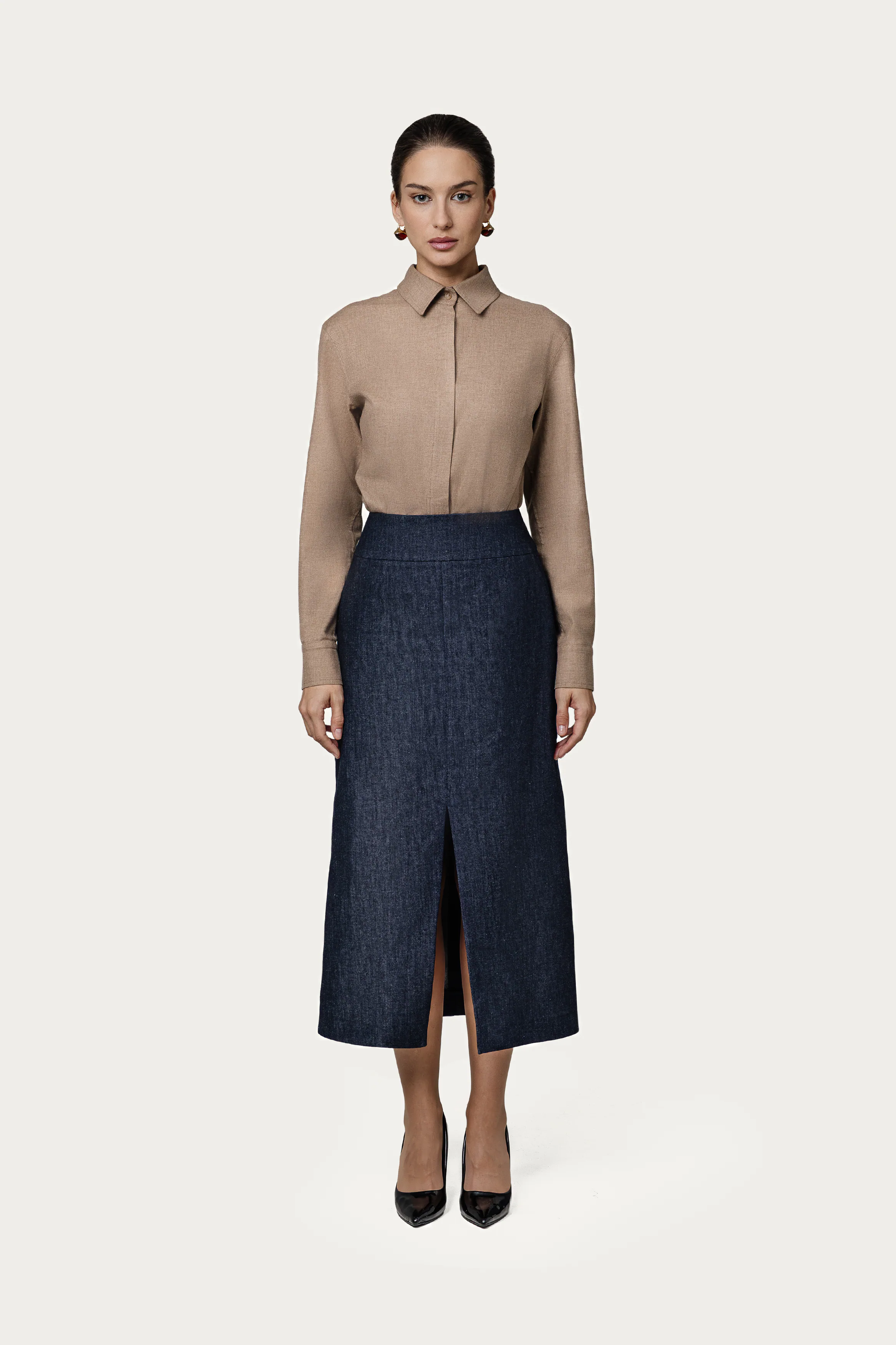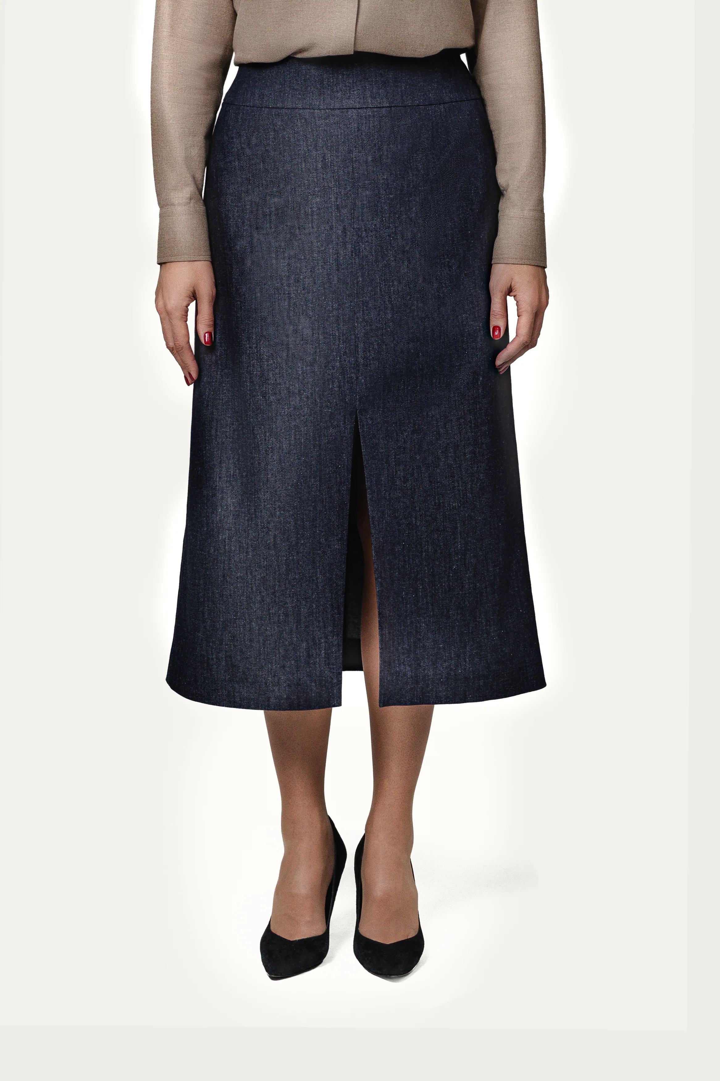 Получить каталогАртикул: Юбка TKK-247 – YB-0009Юбка прямого силуэта в оттенке «джинса» с премиальной отделкой. Разрез добавляет динамики, оттенок — универсальности.Цвет: джинсаСостав: 95% хлопок, 5% эластан -